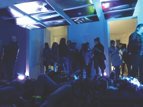 Majowa noc. Centrum Warszawy. Na czwarte piętro przedwojennej kamienicy wchodzimy po pięknych kamiennych schodach. Na podłodze kafelki, poręcze z drewna, szyby w oknach przetrwały wojnę, drzwi do mieszkań zaplombowane, szyb windy zieje pustką. Wszystko skąpane w blasku jarzeniówki. Wchodzimy i wchodzimy. Kiedy wreszcie trafiamy do mieszkania, w którym swoją siedzibę ma #Poligon, z przyjemnością odnotowujemy obecność rozłożonych na ziemi trzech dmuchanych materacy. Chętnie byśmy się na nich rozłożyły na dłużej. Ale legowisko zostało urządzone nie po to, by goście odpoczęli po wspinaczce. Jest częścią prezentacji zdjęć Olgi Czyżykiewicz, które powstały w trakcie lunatykowania. Stąd pomysł na przeniesienie pokazu zdjęć z pionu – w poziom. Leżąc na materacach, można było nie tylko oglądać prace, ale i posłuchać tego, jak brzmi faza snu REM, informacji o somnambulizmie i kołysanki.