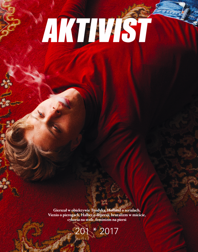 Na okładce najnowszego „Aktivista” wystąpił Jakub Gierszał, autorem okładkowej sesji jest przyjaciel młodego aktora, aktor i fotograf Tomek Tyndyk. W numerze znaleźć można nietypowy wywiad z Agnieszką Holland, która opowiada o pracy nad swoimi ulubionymi serialami i filmem „Pokot”, Olga Wiechnik pisze o brutalizmie w architekturze, Michał Mazur (autor bloga technomad.com) przedstawia sylwetkę dizajnerów z Grynasz Studio, a Hades – raper związany z HiFi Bandą – opowiada o swoich ulubionych albumach.