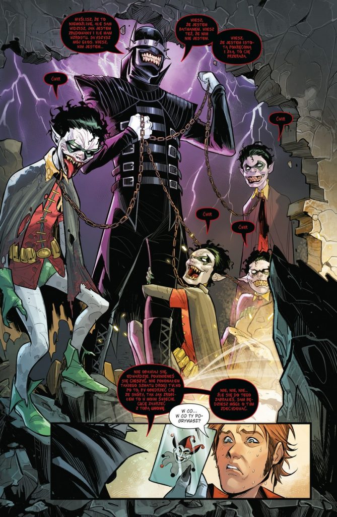Nie będę owijał w bawełnę, „Batman Metal. Mroczne dni” to szalona, apokaliptyczna i odważna jazda bez trzymanki. Rzeczywistość miesza się tutaj z koszmarnymi wizjami, a wraz z rozwojem akcji zostajemy wtłoczeni w coraz dziwniejszy i niepokojący świat. Autorzy nie dają czytelnikowi chwili wytchnienia. Kiedy już na horyzoncie widzimy zarysy jakiegoś ledwo widocznego bezpiecznego lądu, Snyder i Capullo utrudniają, jak tylko mogą odbiorcy dotarcie do niego. Sytuację tę niuansują nieco elementy humorystyczne i możliwość obserwacji interakcji między poszczególnymi postaciami, jednak i tak musimy być cały czas czujni, by nie zgubić się w tej super dynamicznej opowieści. Snyder, jak zwykł robić to w przeszłości, poszerza wszechświat DC w nowych kierunkach i ukazuje naszych ukochanych bohaterów w nowej perspektywie. Każda plansza tryska energią, świetnie dobranymi kolorami i fenomenalnie narysowanymi postaciami. Naprawdę ciężko się tu do czegokolwiek przyczepić. Jest kilka spektakularnych scen, które robią duże wrażenie i na długo zapadają w pamięć.