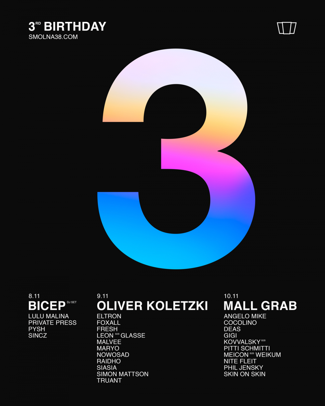 Przed nami kolejne urodziny jednego z najważniejszych punktów na muzycznej mapie Polski. 3 lata działalności Smolnej podsumują 3 wydarzenia, podczas których wystąpi aż 33 artystów, na czele z takimi headlinerami, jak Bicep, Mall Grab i Oliver Koletzki. Urodziny klubu odbędą się między 8 a 10 listopada.