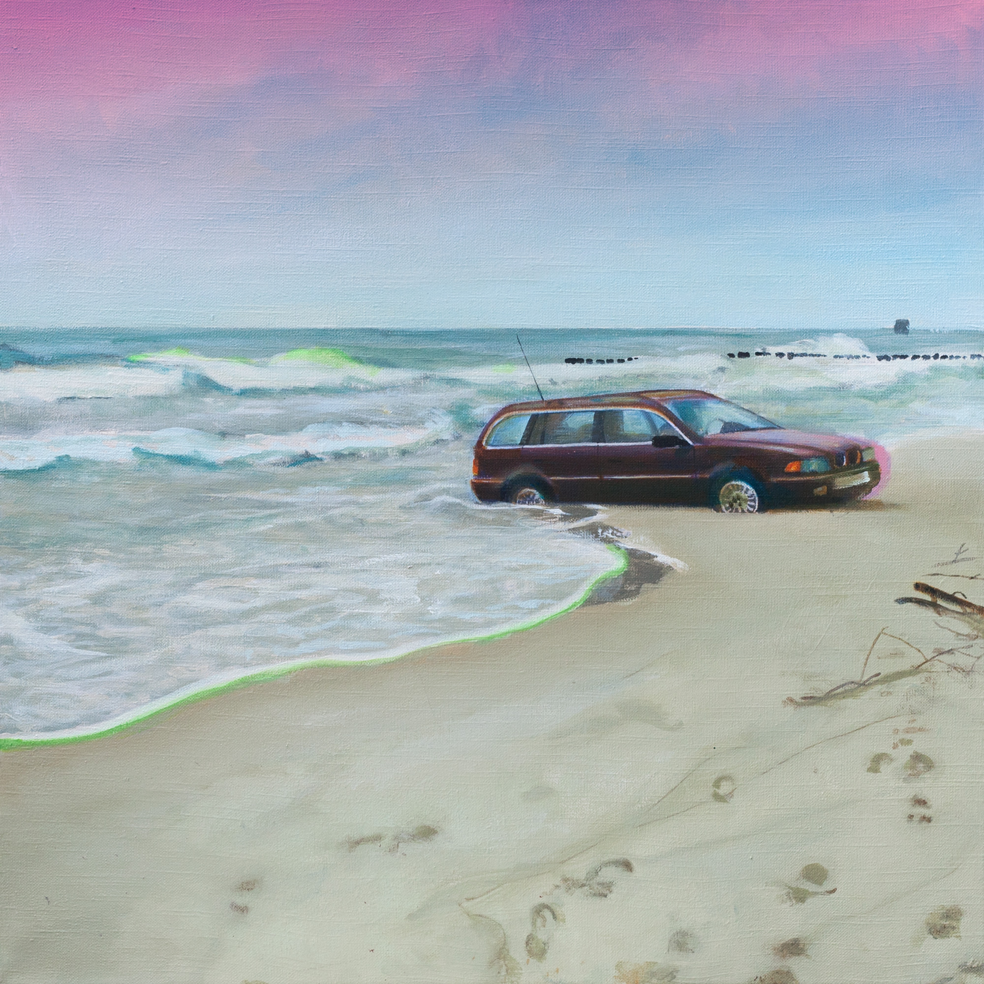 Łukasz: Tak, i to całkiem ciekawa! Rok temu była taka akcja, o której wiele osób już chyba nie pamięta: jakiś typ w Mielnie w styczniu wjechał autem na plażę, a potem przyszedł odpływ i zaczęło go ściągać. Zobaczyłem to w necie, wysłałem do Leny i pomyślałem, że to jest zajebiste: jest groza, są wakacje, jest idealne auto, które kompletnie nie pasuje do całości. Nic się tu nie zgadza. Trudno to ugryźć. Napisałem do fotografa, który zrobił to zdjęcie i on pozwolił nam je wykorzystać. Wstępnie chcielismy je tylko podrasować, ale stwierdziliśmy, że jak zrobimy z tego obraz, to nadamy temu wydarzeniu rangę i będzie to dzieło sztuki. Szczególnie, że Zbiok od razu złapał o co nam chodzi. No i jest: olej na płótnie 50×50. Oryginał wisi na razie u mnie w domu.