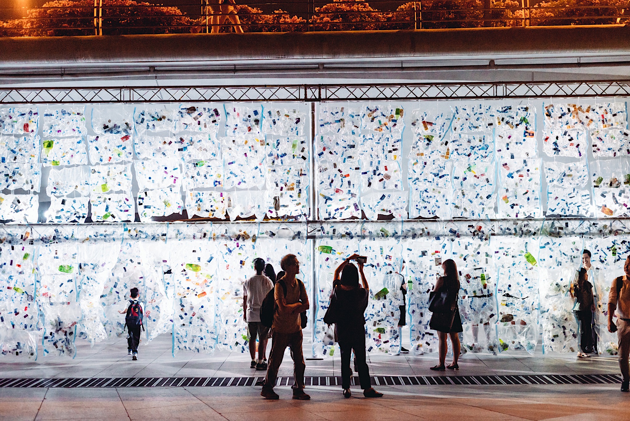 Zajmujący się instalacjami przestrzennymi hiszpański kolektyw Luzinterruptus stworzył w jednej z najbardziej ruchliwych części Singapuru siedem podświetlanych plastikowych ścian. Wykonane one zostały z worków próżniowych, wypełnionych zużytymi butelkami.