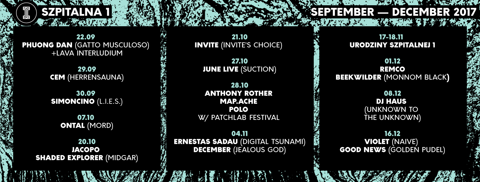 W programie jesiennym klubu znalazły się także nowe cykle imprez. Po raz pierwszy Szpitalną 1 odwiedzi śląski cykl Module. Jego gośćmi będą Invite, czyli nikt inny jak Tim van Paradijs, właściciel prężnie działającej wytwórni muzycznej stojącej za jednym z najbardziej rozpoznawalnych serii podcastów Invites Choice, oraz Remco Beekwilder, holenderski dj, którego sety i produkcje charakteryzują się energią oraz głębią wyraźnie zakorzenioną w muzyce techno.