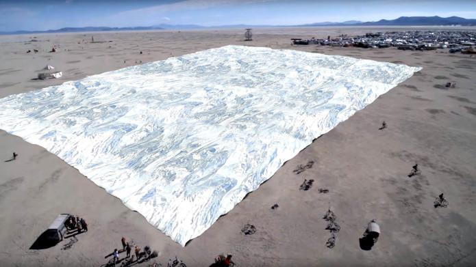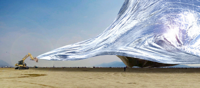 Pomysł nie jest aż tak rewolucyjny, jak mogłoby się wydawać. Choć mowa tu o technologii kosmicznej, bo za wynalezieniem termicznych koców stoi NASA, to materiał taki jest w użytku od ponad pół wieku i możecie znaleźć go chociażby w samochodowej apteczce. Sztanuk stawia jednak na widowiskowość – jego foliowa płachta ma niby mieć powierzchnię 100 na 100 metrów, ale to tak naprawdę 3350 zwykłych koców połączonych ze sobą za pomocą 40 km mocnej taśmy klejącej. Instalacja ma jednak falować nad terenem Burning Mana i dawać cień spragnionym festiwalowiczom.