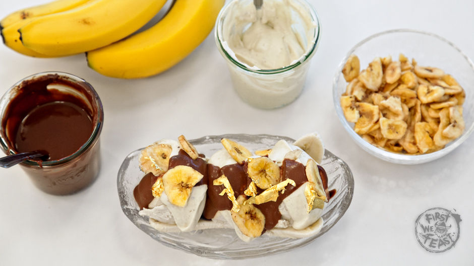 Lody z banana i agawy, z dodatkiem bitej śmietany, bananów i czekoladowego sosu (22$)