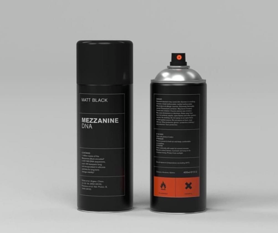 Kod DNA, w którym zapisano sekwencje albumu, został następnie przerobiony na farbę i wydany w limitowanej edycji sprejów w kolorze białym i matowym czarnym. Każda z puszek sprayu zawierać ma około miliona „dawek” płyty. Zastanawiacie się pewnie czy poza mazaniem po murach można cokolwiek zrobić z “Mezzanine” w spreju. Owszem zapisanych w ten sposób utworów będzie podobno można posłuchać po przekonwertowaniu ich na plik dźwiękowy.