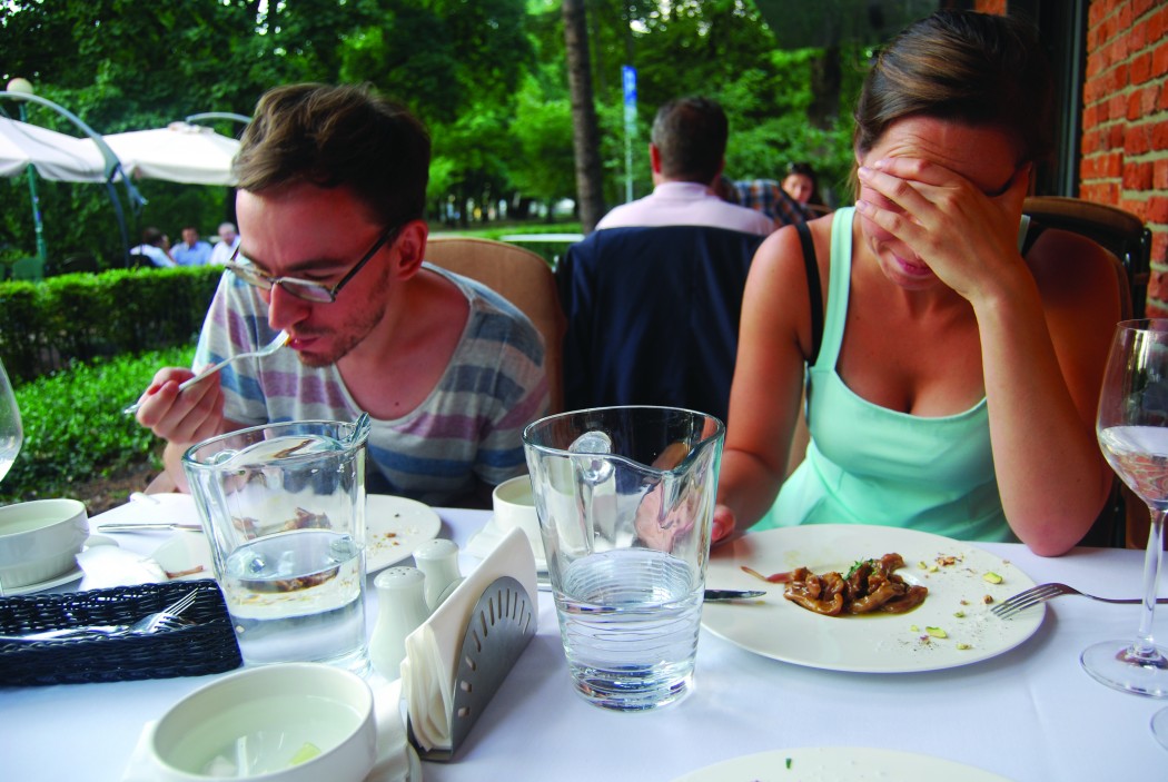 Te kaczki już nie zakwaczą. My za to nad naszymi talerzami z kaczymi języczkami, konfitowanymi w maśle z miodem gryczanym i pistacjami (specjalność Zielonego Niedźwiedzia), trochę kwakaliśmy. Trudne to było danie, nie na nasze podniebienia te języki. Żebyście i wy mogli się sprawdzić, jeśli Zielonego Niedźwiedzia nie możecie odwiedzić, to poniżej podajemy przepis. Konfitujcie! (czyli: poddajcie mięso bardzo wolnej obróbce cieplnej) Kafe Zielony Niedźwiedź została uznana przez „Gazetę Stołeczną” Knajpą Roku 2014. Postanowiliśmy dać sławie wybrzmieć i odwiedziliśmy ją dopiero teraz. Lato wizytom w Niedźwiedziu sprzyja, bo najprzyjemniej siedzi się tu na zewnątrz, w ogródku, a właściwie parku, w którym ta knajpa jest usytuowana. Nie będziemy ukrywać, mimo pięknych okoliczności przyrody i świetnego jedzenia czuliśmy się tu jednak trochę nieswojo. Restauracja, powstała z inicjatywy Związku Przedsiębiorców i Pracodawców, wypełniona była reprezentantami obcego nam gatunku, który określić można pojemnym słowem „biznesmeni”. A ci, zdaje się, nie lubią, jak się do nich uśmiecha, bo wszyscy kelnerzy (oprócz jednego) miny mieli raczej grobowe. Ale z każdym kolejnym daniem czuliśmy się bardziej na miejscu. Karta Niedźwiedzia często się zmienia, kuchnia czerpie z polskiej tradycji („gotujemy, jakby wojny nie było” – można przeczytać w ich manifeście), jest świetna, nieprzekombinowana, liczą się w niej przede wszystkim dobre produkty, które bronią się same. Produkty te można zresztą kupić (albo zamówić) na miejscu, bo Zielony Niedźwiedź to też delikatesy.