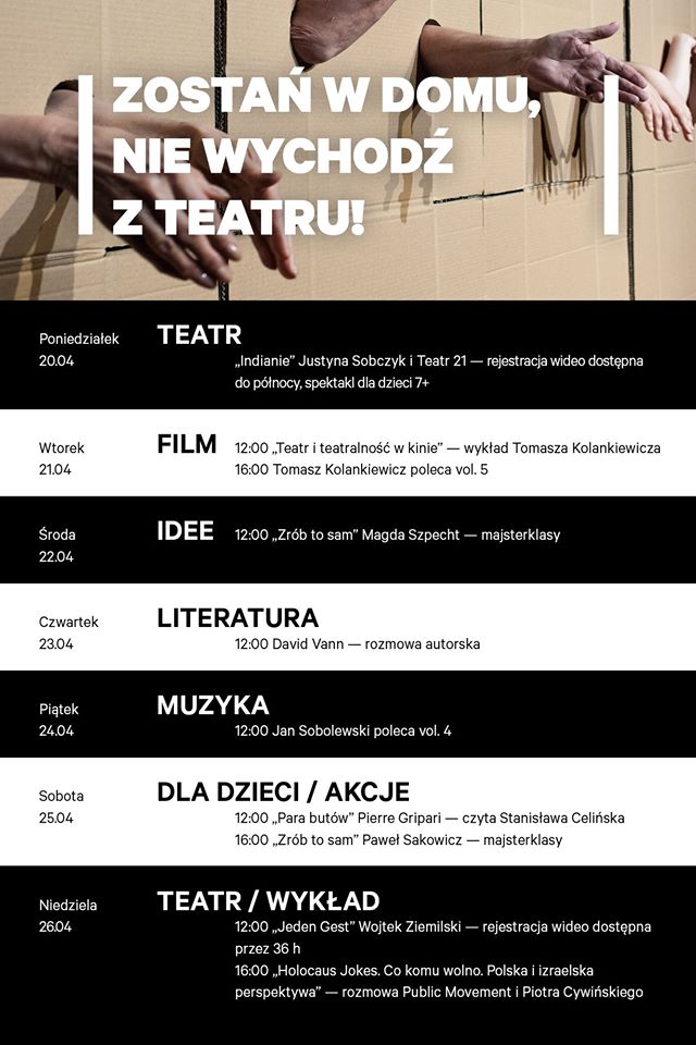 “Wznowiliśmy cykl „Zrób to sam” – majster klasy, w którym eksperci z różnych dziedzin udzielają porad jak coś stworzyć, czegoś się nauczyć, spędzić czas pożytecznie. W tym tygodniu odcinki poprowadzą Magda Szpecht – reżyserka spektaklu Lipa w cukrze oraz choreograf i tancerz Paweł Sakowicz, który jest odpowiedzialny za repertuarowy spektakl Nowego Teatru Masakra. Dzieciom przybliżymy kolejne opowiadanie z tomu Opowieści z ulicy Broca Pierre’a Gripariego, tym razem w interpretacji Stanisławy Celińskiej. Natomiast w niedzielę o godzinie 12:00 premierowo udostępnimy rejestrację spektaklu Jeden Gest w reżyserii Wojtka Ziemilskiego.”