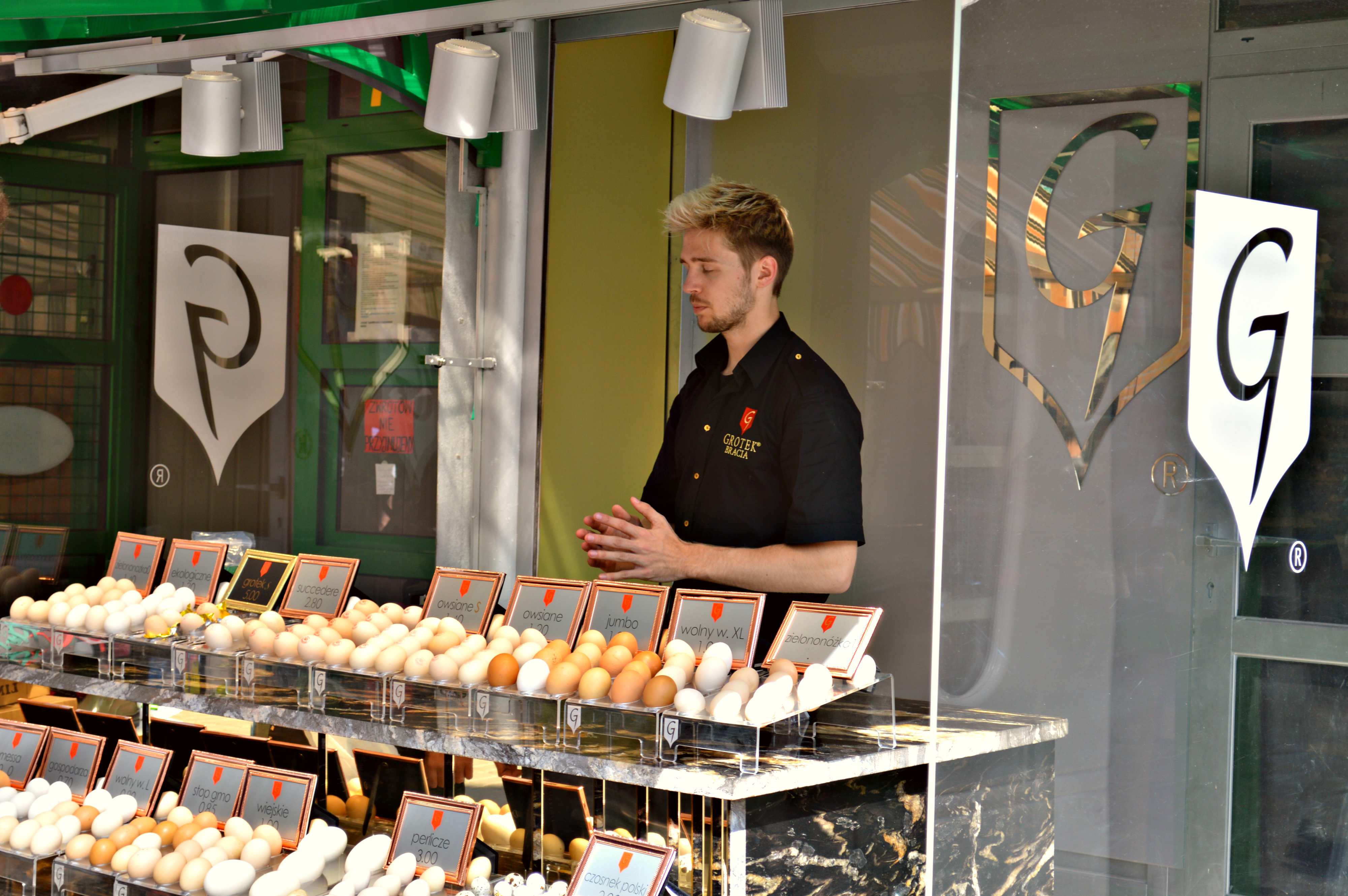 Inaczej rozmowa wygląda przy stoisku wyróżniającym się mocno na tle innych w alejce. Podesty dla jajek, starannie przygotowana ekspozycja, złote papierki, marmurowa, sprowadzona z Włoch (sic!) lada, opakowania niczym w ekskluzywnym butiku. Bo też i jajka ekskluzywne, od ekskluzywnych kur. Trafiłam na stoisko Braci Grotek.