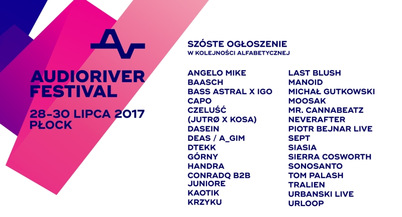 Organizatorzy Audioriver ogłaszają ostatnich artystów zasilających program głównej części festiwalu, czyli tej odbywającej się na plaży nad Wisłą w piątek 28 i sobotę 29 lipca. Do niemal 50 ogłoszonych wcześniej projektów, właśnie dołączyło blisko 30 polskich twórców, a wśród nich m.in. Baasch, Czeluść (JUTRØ x KOSA), Bass Astral x Igo, Urbanski live, Last Blush oraz DEAS/A_GIM. Z kolei namiot reprezentujący lokalne sceny klubowe, Cities: #TrueMusic Tent, w tym roku we władanie wezmą przedstawiciele Poznania i Górnego Śląska.