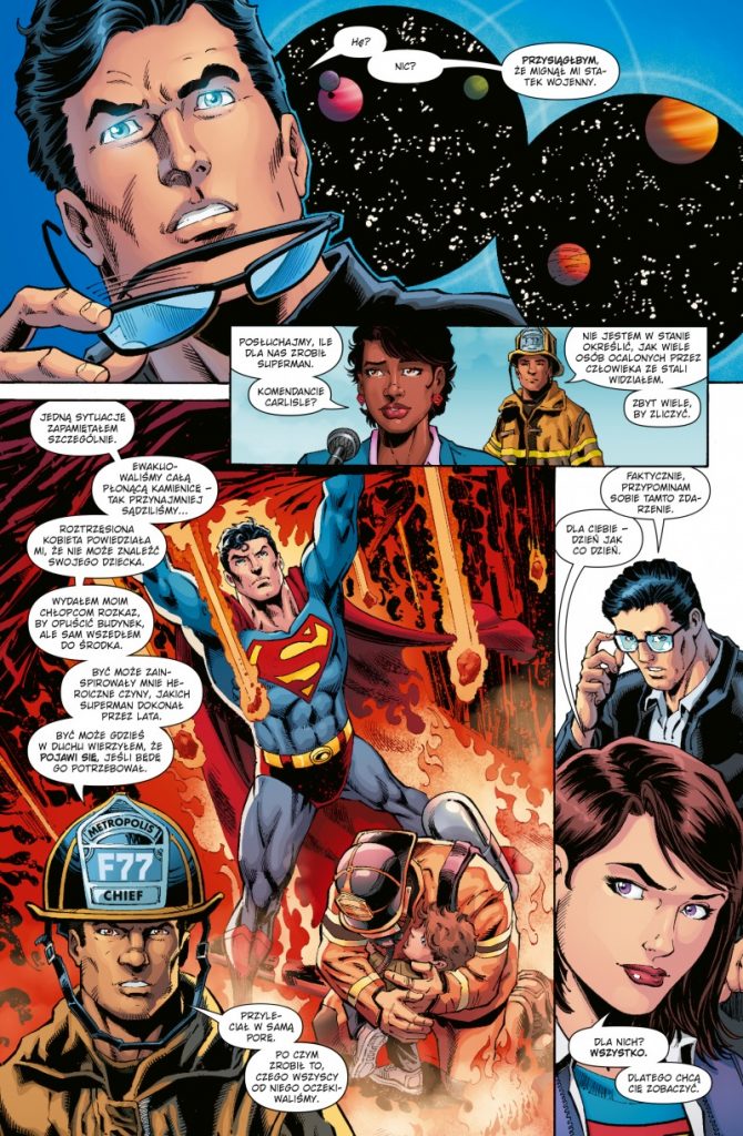 Te historyjki pokazują dobitnie, że czytelnik nie trafił na osiemnastkę, tylko na potańcówkę w domu starców. Ani wydawca, ani uznani twórcy nie zdecydowali się lub nie potrafili zrobić czegoś, co miałoby w sobie jednocześnie powiew świeżości i pokazywało potencjał postaci. Zamiast tego jest mielenie znanych wątków i przywoływanie dawnych wrogów. Nawet aspekt społeczno-rodzinny fabuł o Supermanie, który można ciągle traktować jako pewne novum, został zaprezentowany bardzo sztampowo. Oczywiście kilka komiksów jest ciekawych treściowo, graficznie lub formalnie (jak „Wewnętrzny wróg”, „Wóz” czy „Pięć minut”), ale żadna nich nie porywa i nie zapada specjalnie w pamięci. Czytając tysięczny numer Supermana, cały czas czułem zapach popiołu. Tym intensywniejszy, im miałem wrażenie, że wypalił się nie tylko potencjał postaci, ale także wielcy twórcy. Może trzeba było pozwolić uczcić Kryptończyka młodym lub niezależnym twórcom? Marudzę, ale muszę przyznać, że jak na trykociarki komiks nie jest źle.