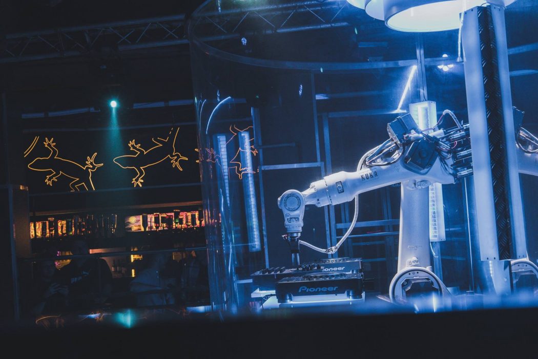 Wszystko zaczęło się od wyzwania rzuconego przez właścicieli klubu jednej z technologicznych firm. Specjalnie zmodyfikowane i zaprogramowane ramię znanej w przemyśle robotycznym firmy KUKA rozpoczęło swoją klubową służbę na początku grudnia. Z czasem ma ono zostać udoskonalone i korzystać z uczących się algorytmów. I choć prawdopodobnie nigdy nie będzie wyczuwało potrzeb tłumu tak dobrze jak człowiek, jest bardzo zaangażowane w swoją pracę. Czasami nawet bardziej, niż kilku “analogowych” DJ-ów, których znamy.