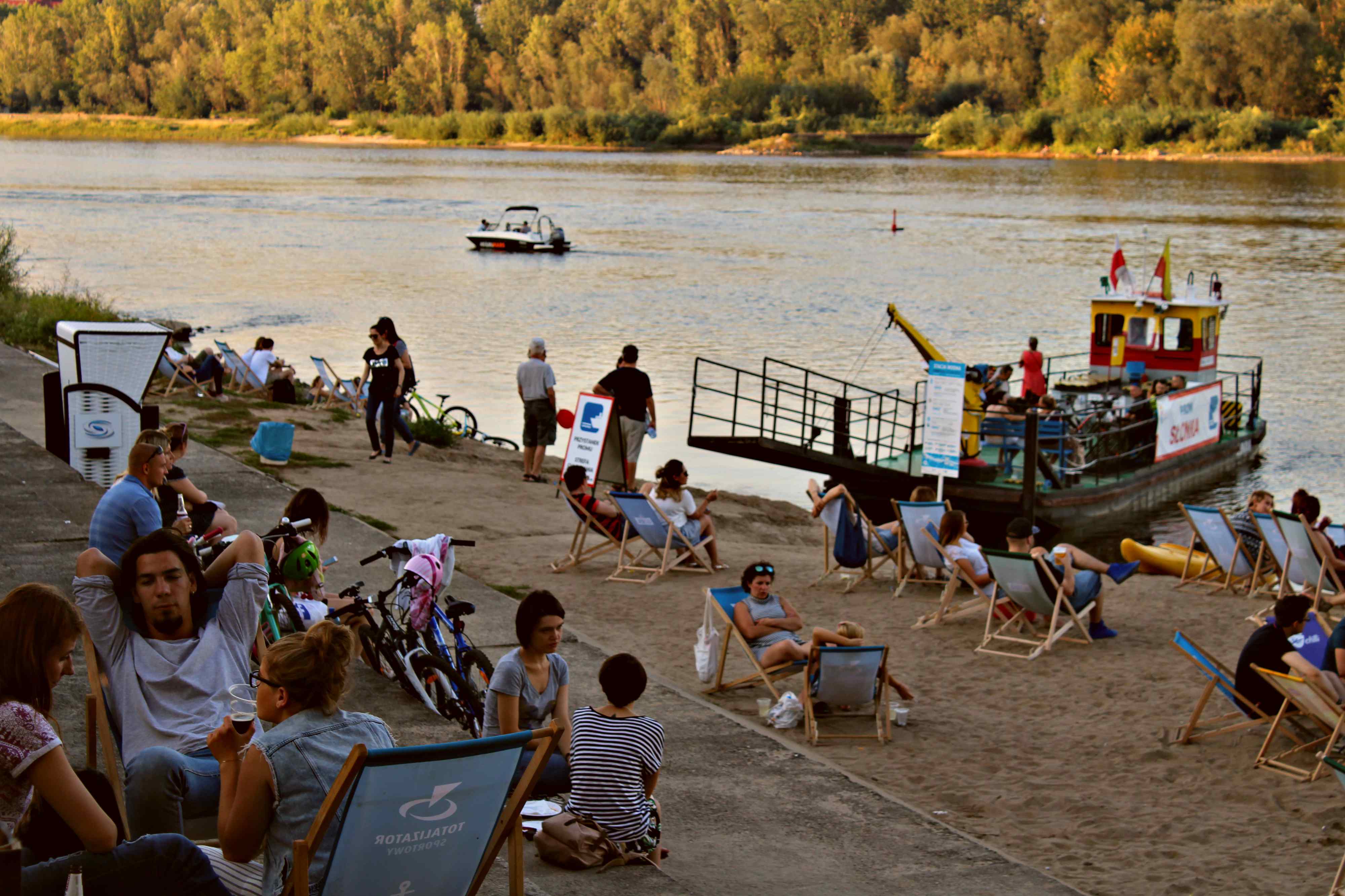 Przepływanie przez Wisłę promem, targi w parkach, koncerty nad Wisłą.