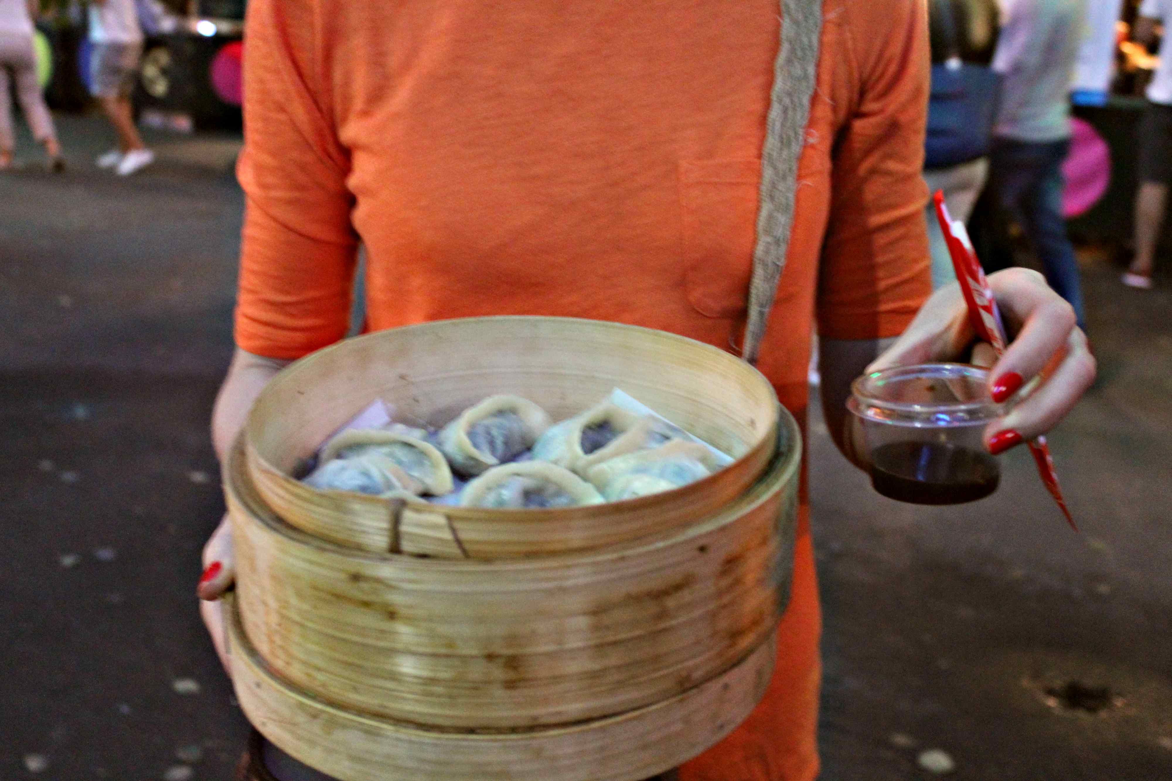 Podczas odbywających się co tydzień w weekendy targów smacznego jedzenia można spróbować smaków z całego świata. Karolina, z którą udało nam się chwilkę porozmawiać najchętniej przychodziła na danie fit – pierożki na parze.