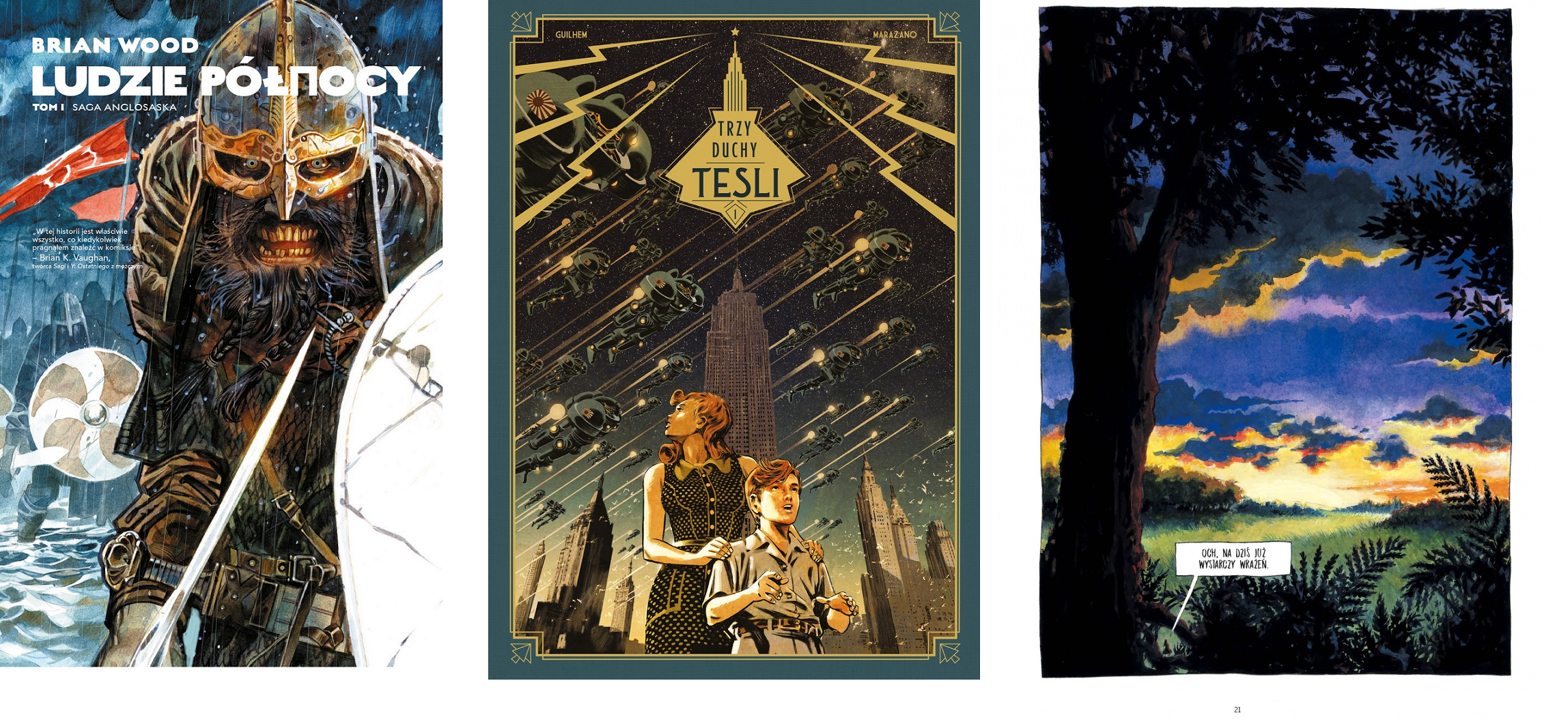 Wystarczy spojrzeć na okładkę, żeby chcieć sprawdzić serię „Trzy duchy Tesli”. Na tle Empire State Building stoi matka z synem. Nad nimi lecą szwadrony robotów z japońską flagą na ramieniu. Pierwszy tom nowego cyklu sci-fi o tytule „Sztokawska tajemnica” rozgrywa się w Nowym Jorku w 1942 roku, tuż po zniknięciu Nikoli Tesli. W rzece widać dziwne światła, znikają bezdomni, trwa wojna… Głównym bohaterem jest nastolatek, co sugeruje wiek odbiorców, ale realistyczna kreska Guilhema, którą dopełniają kapitalne, stonowane i przyciemnione kolory, w połączeniu z zapowiedzią niezłej przygody potrafią obudzić w każdym nastolatka.