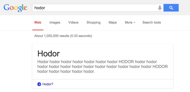 Dla tych, którzy śledzą losy serialu nie jest już niespodzianką informacja o tym, że w piątym sezonie nie zobaczymy ani Hodora ani Brana, dlatego powinniśmy docenić, że Google postanowił poprawić nam trochę humor wyjaśniając bardzo dokładnie co oznacza słowo Hodor.